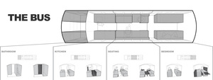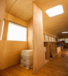 Con un mobiliario de madera y un suelo de gimnasio logra un resultado como si de una casa nueva se tratase, con zonas diferenciadas para el conductor, el cuarto de baño, la cocina, la sala de estar y el “dormitorio” o zona de reposo. Además, logró privacidad colocando unos aislantes traslúcidos que se fijan con imágenes y añadió dos claraboyas para ganar luz natural.